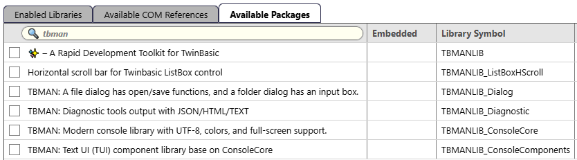It appears woeoio2's polished TUI (text-based user interface) is available to all twinBASIC users as twinPACK code packages, available via Project > References... > Available Packages. From woeoio2 in Discord: