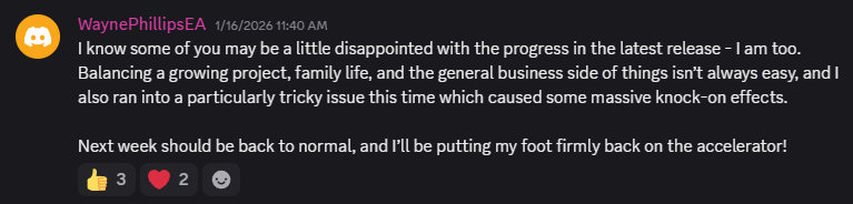 I know some of you may be a little disappointed with the progress in the latest release - I am too. Balancing a growing project, family life, and the general business side of things isn’t always easy, and I also ran into a particularly tricky issue this time which caused some massive knock-on effects.