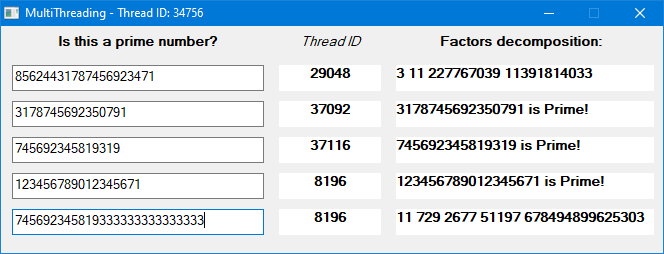This project is showcasing the WinRT ThreadPool class demonstrating how to create multiple threads to perform lengthy tasks and then communicate the results via "event-like" callbacks. In this example, we are using 5 threads and each thread is checking whether a rather large number is prime or not.