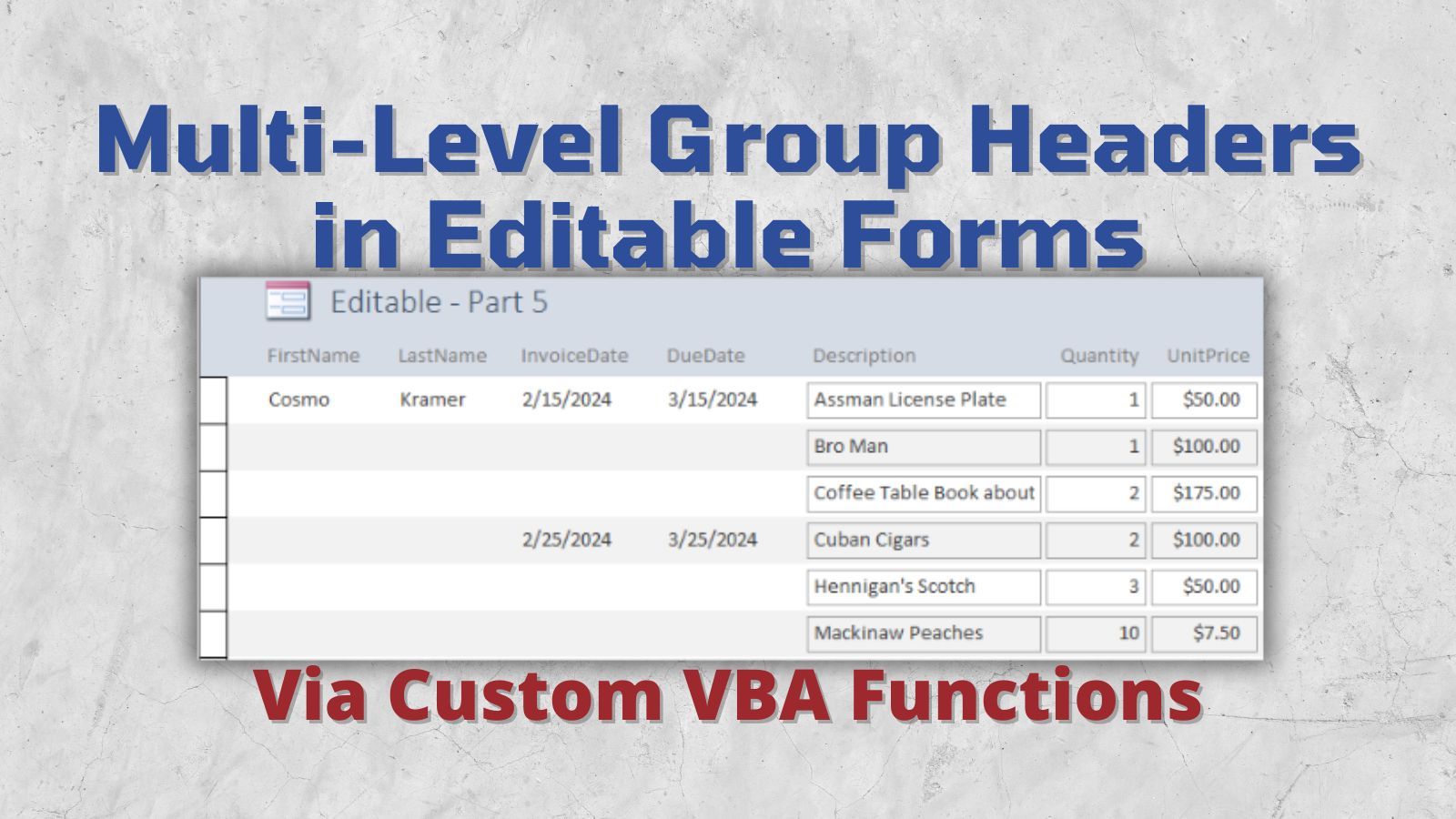 In this article, we will use custom VBA functions to create an editable continuous form that hides duplicate values for multiple levels of "group header" columns.